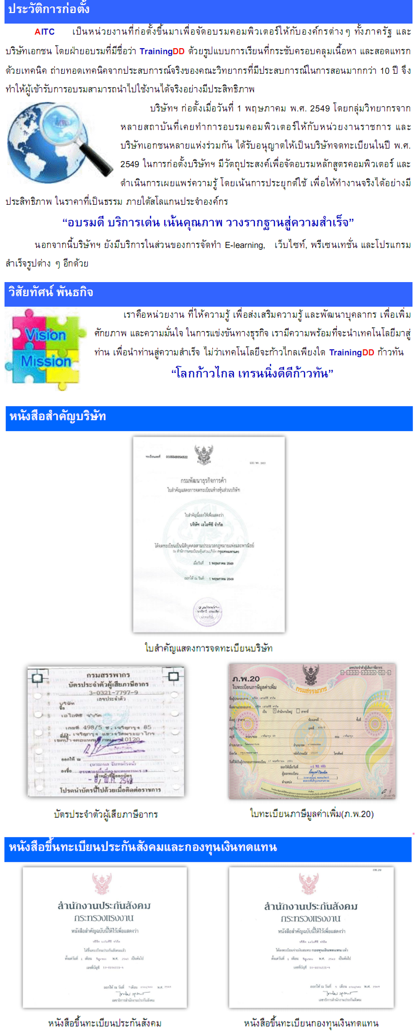 บริษัท เอไอทีซี จำกัด 498/5 เจริญกรุง 85 วัดพระยาไกร บางคอแหลม กรุงเทพฯ 10120 โทร 08-9776-8094 หรือ 09-0656-6435 Trainingdd.com@2005